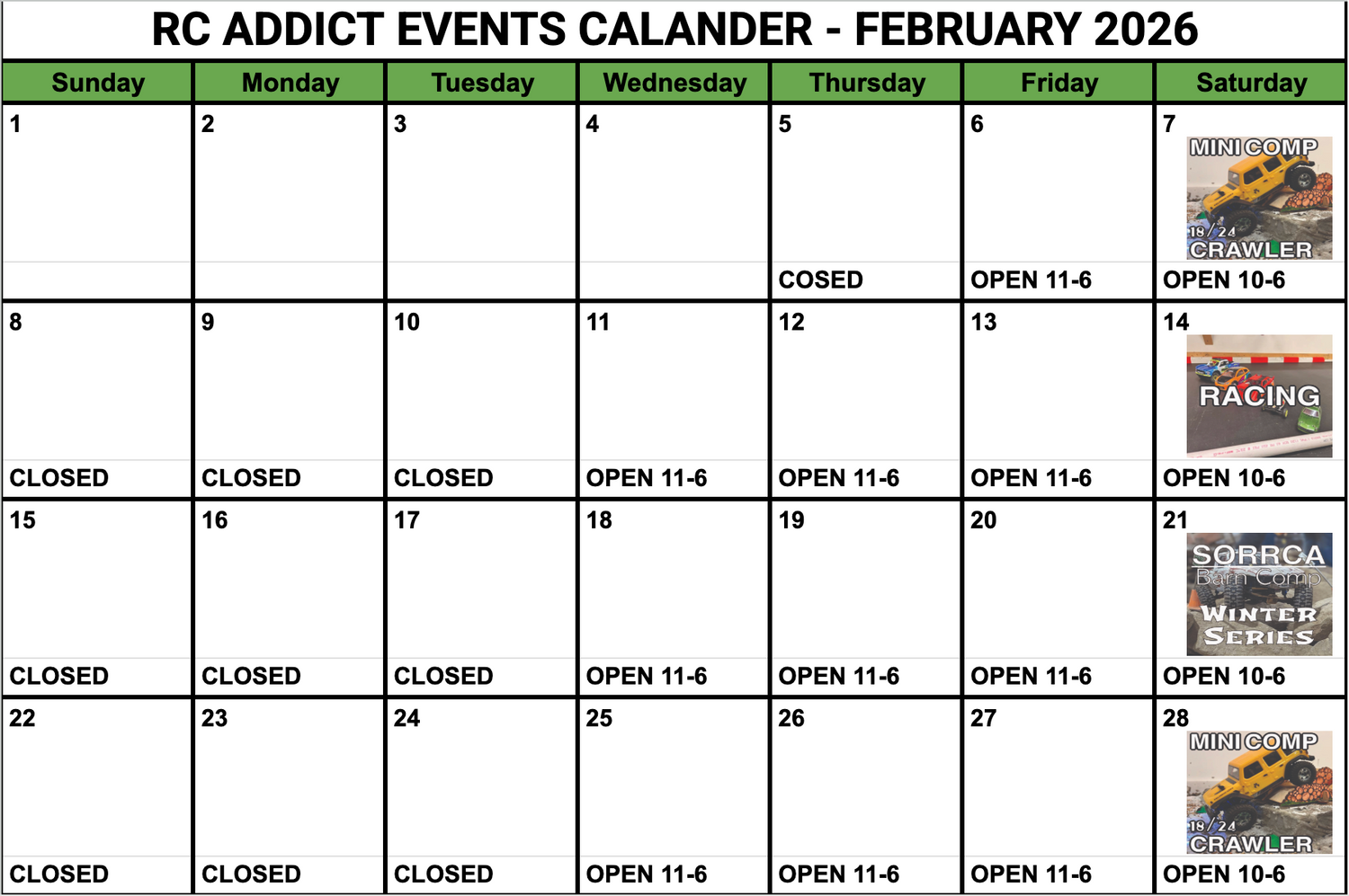Notice: If there is a Race Schedualed, the mini indoor crawler course will be closed until the race event is concluded. If there is a mini crawler comp scheduled, the race track will be closed for the day.