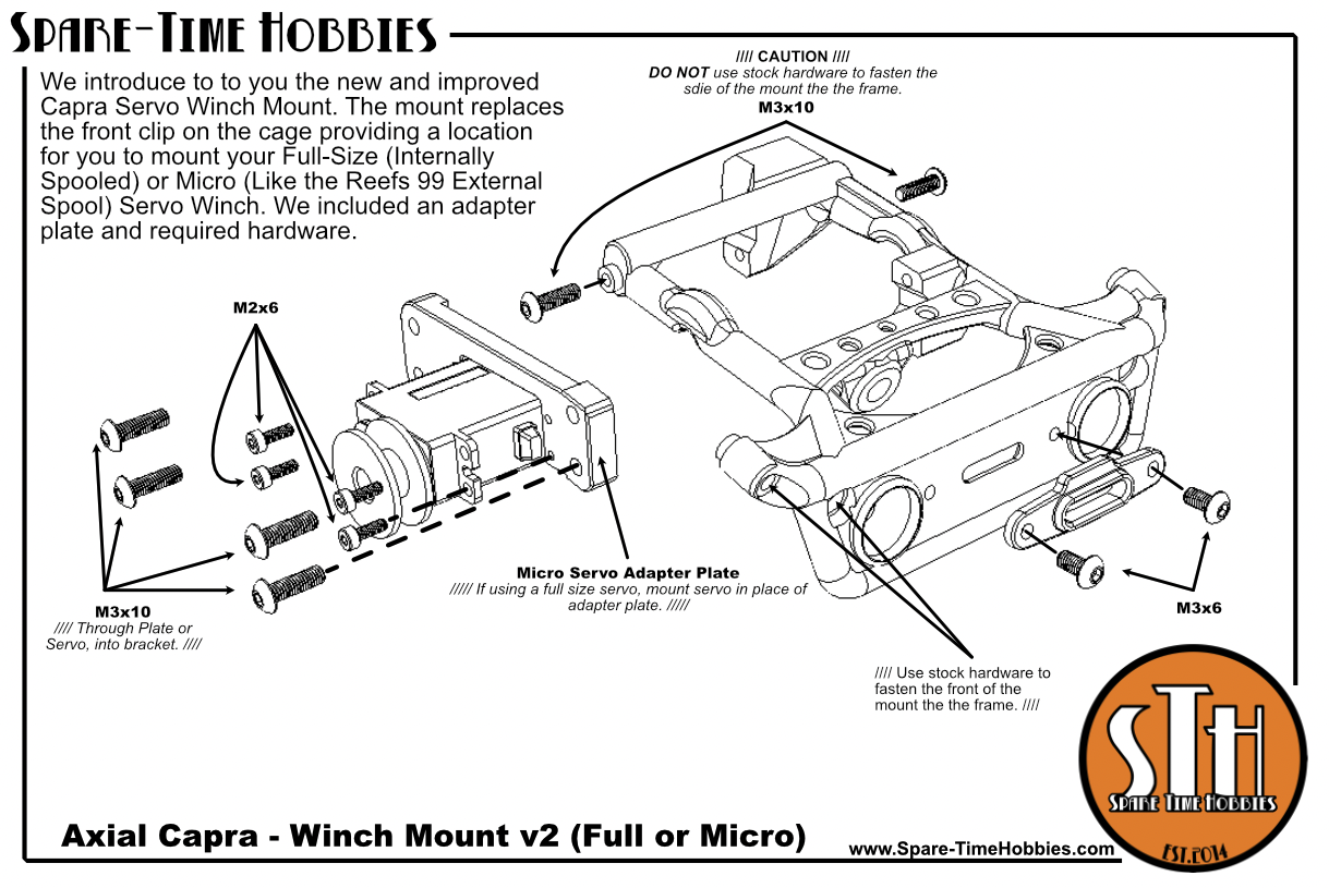 We introduce to to you the new and improved Capra Servo Winch Mount. The mount replaces the front clip on the cage providing a location for you to mount your Full-Size (Internally Spooled) or Micro (Like the Reefs 99 External Spool) Servo Winch. We included an adapter plate and required hardware.