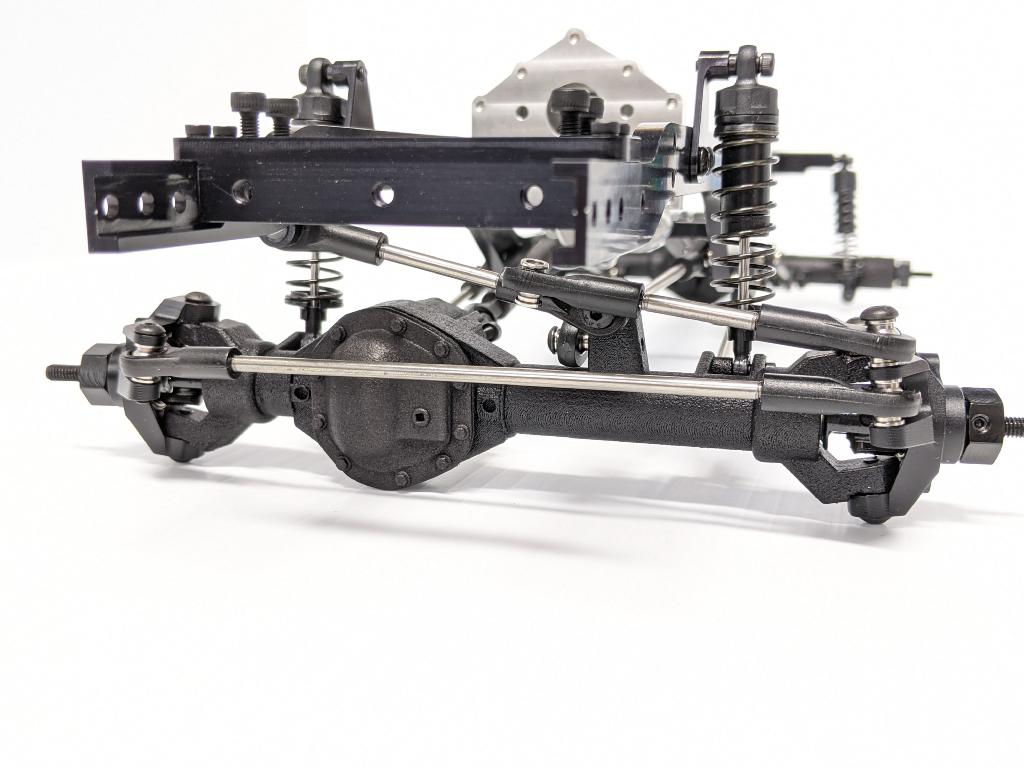 With this Slider Kit you get a giant pile of stuff to build... There's a complete set of Right drop Chevy Dana 44 ST2 axles from GCM, sporting Aluminum knuckles, 49deg steering Uni front shafts, 6 bolt lockers, and SCX2 compatible gearing. The center drivetrain includes our LRT2 Low Range Scale transmission and OverDrive Tcase, and we've paired it all together with a stainless steel link kit, steel center driveshafts, and oil filled shocks. It's a complete slider kit ready for you to build up!