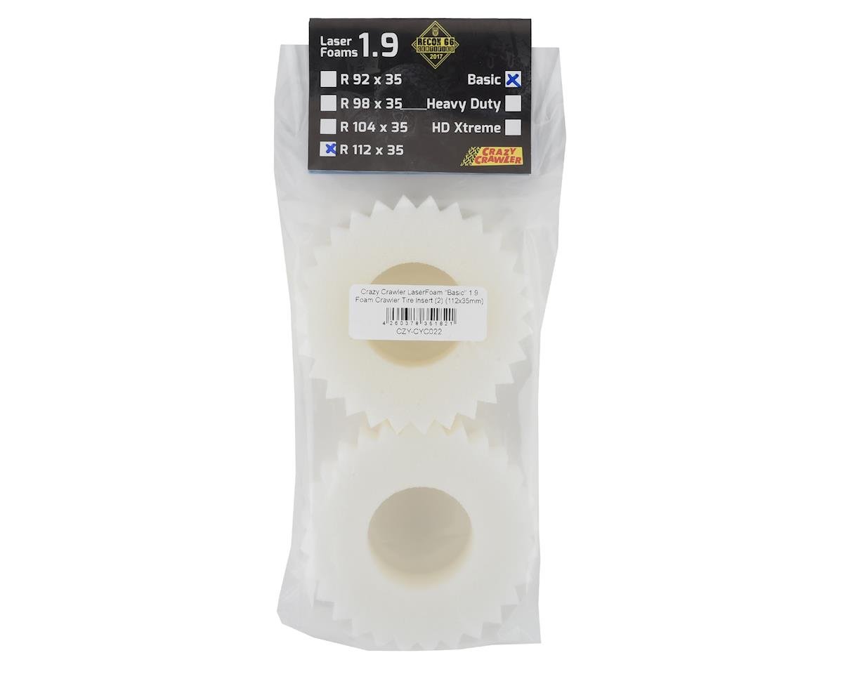 Crazy Crawler LaserFoam "Basic 112x35" 1.9 Foam Crawler Tire Inserts are precision cut open cell foam tire inserts designed for performance. LaserFoam inserts offer incredible lateral stability and sidewall support, yet still remain nice and soft on the contact patch. The material and cut shape ensure that the tire only rolls in the area of the tread that is in contact with the surface, creating great driving characteristics and an incredibly scale look. Plus, the soft open cell foam material allows the insert to fit even when internal weight is added.