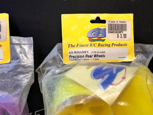This is a lot of on Road GS Racing mixed batch of 1/10th and 1/8th scale on road Wheels. The look to be for Foam tires. Rims are smooth with no groove.