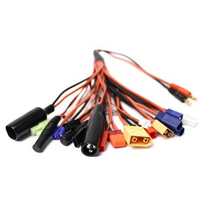 Known around our office as the "giant squid", this charge adapter is an absolute must for your store's service department and for experienced, diversified consumers. Includes the following plugs to address most any charging requirement: Futaba TX, JR TX, Universal RX, EC5, EC3, EC2, XT90, XT60, T-Plug, Tamiya-style Molex, Mini Tamiya-style Molex, EFL/BLH micro, Hubsan-style micro, Glow Plug (for charging Ni-Starters), HC (Traxxas-style), XH-style micro, Molex mini, JST, XL JST (Mini-T style connector), and finally a blank set of wires to add any type of connector we may have forgotten. This is absolutely the finest and most versatile charging squid you or your customers may ever need.