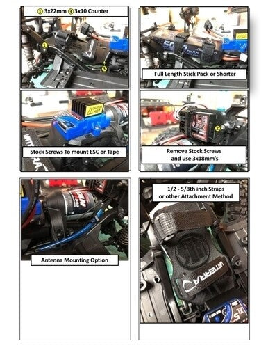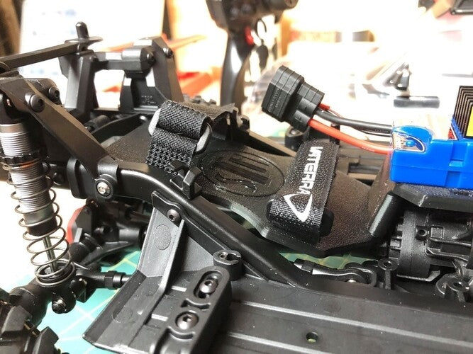 You will need to source two 1/2-5/8in wide straps. Similar to the ones that come with Axial, Vaterra or Gens Ace) Alternatively, you can use velcro to hold it all down.