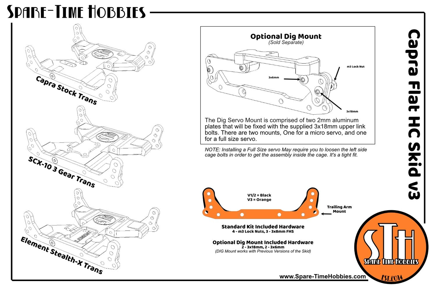 v3 Release: Version three has added two lower lower mounting holes on the spine to provide the ability to use ether trailing arms or an additional upper link mounting position if used with bent links. Secondly, I have redesigned the dig servo mount and made it an add on option to allow those with earlier versions of skid to purchase the upgraded dig mount. Overall price of the skid has been reduced to accommodate for the change. The new dig mount will consist of two 2mm aluminum tabs, hardware, and a full/micro servo printed mounting bracket. Finally the spin has been slightly modified for look. The original servo mount bracket will be available as a free down-load should you wand to print your own mounts.