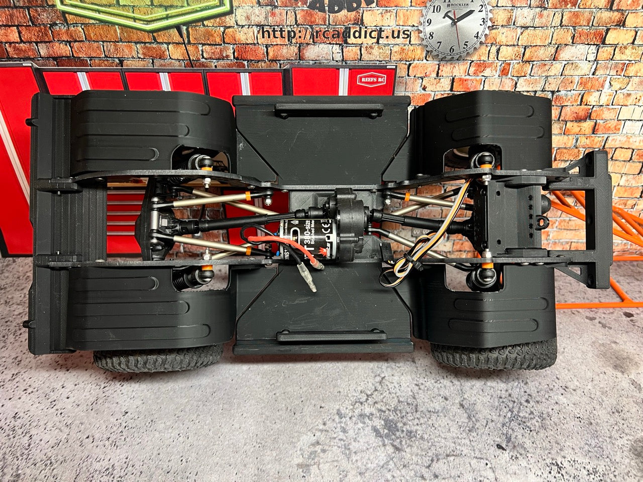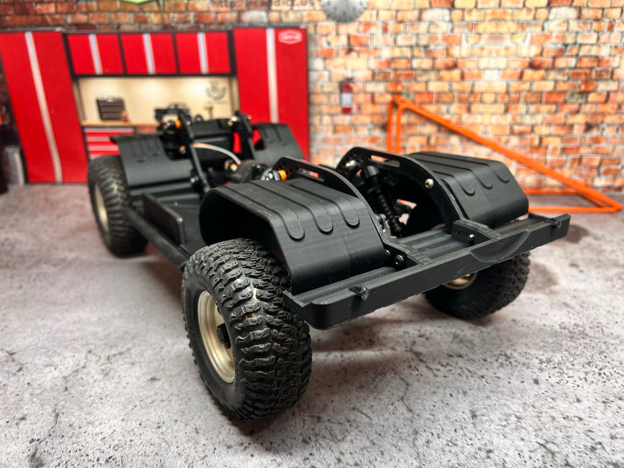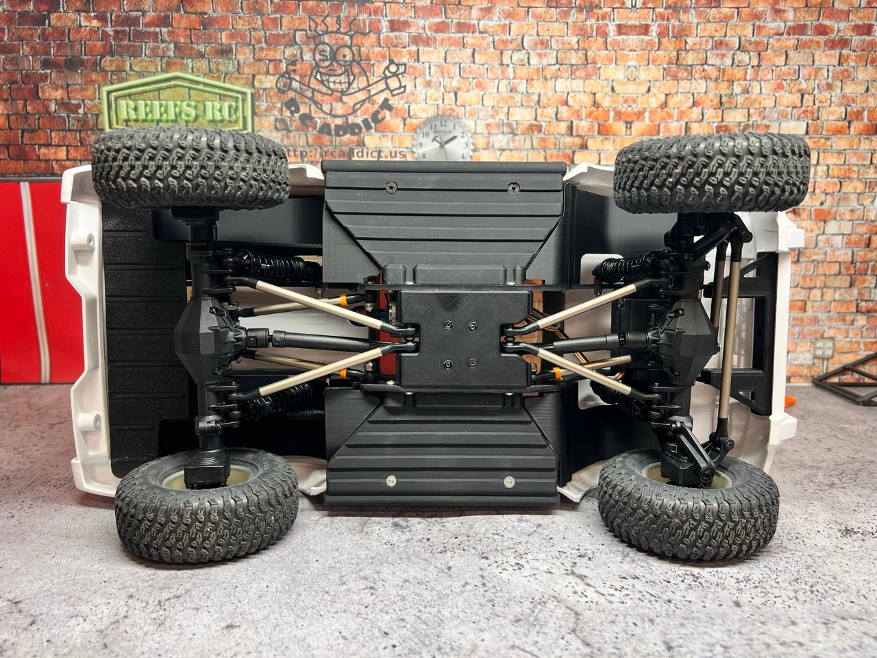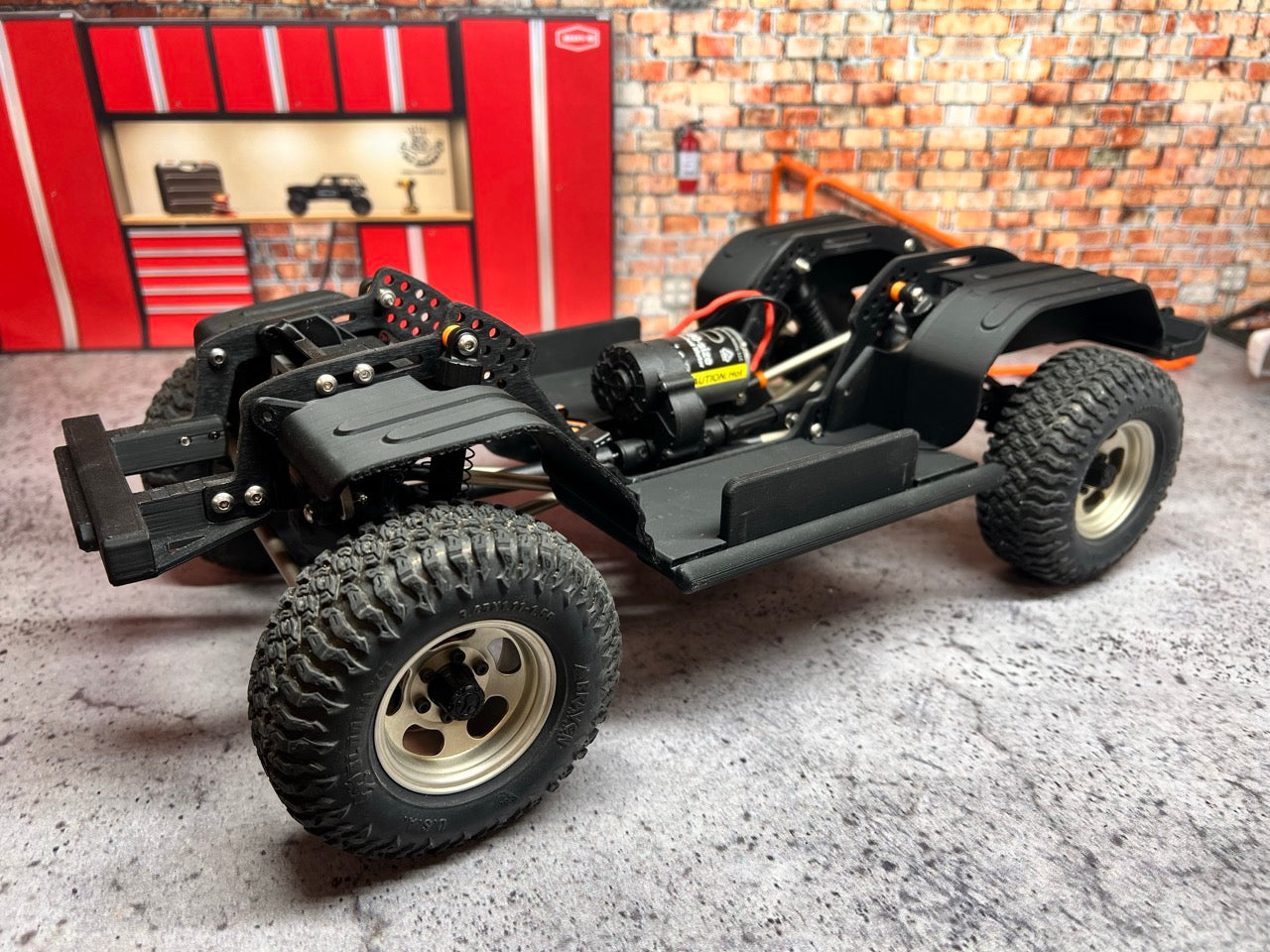 Recommended: Due to the increased weight, I recommend adding Foam to the stock tires. Though they do work as is, it drives like you have 8 PSI in your tires and can flatten out with heavy articulation. Additionally, use the narrow 12mm Hex from the kit in the front and standard width in the rear. If you are using custom wheels, adjust offset as needed. Heavier Springs would do it well unless you like the Droop driving experience. The current springs let the rig settle down like it's on hydraulics. It feels nice when driving but may need some preload added or stiffer springs.