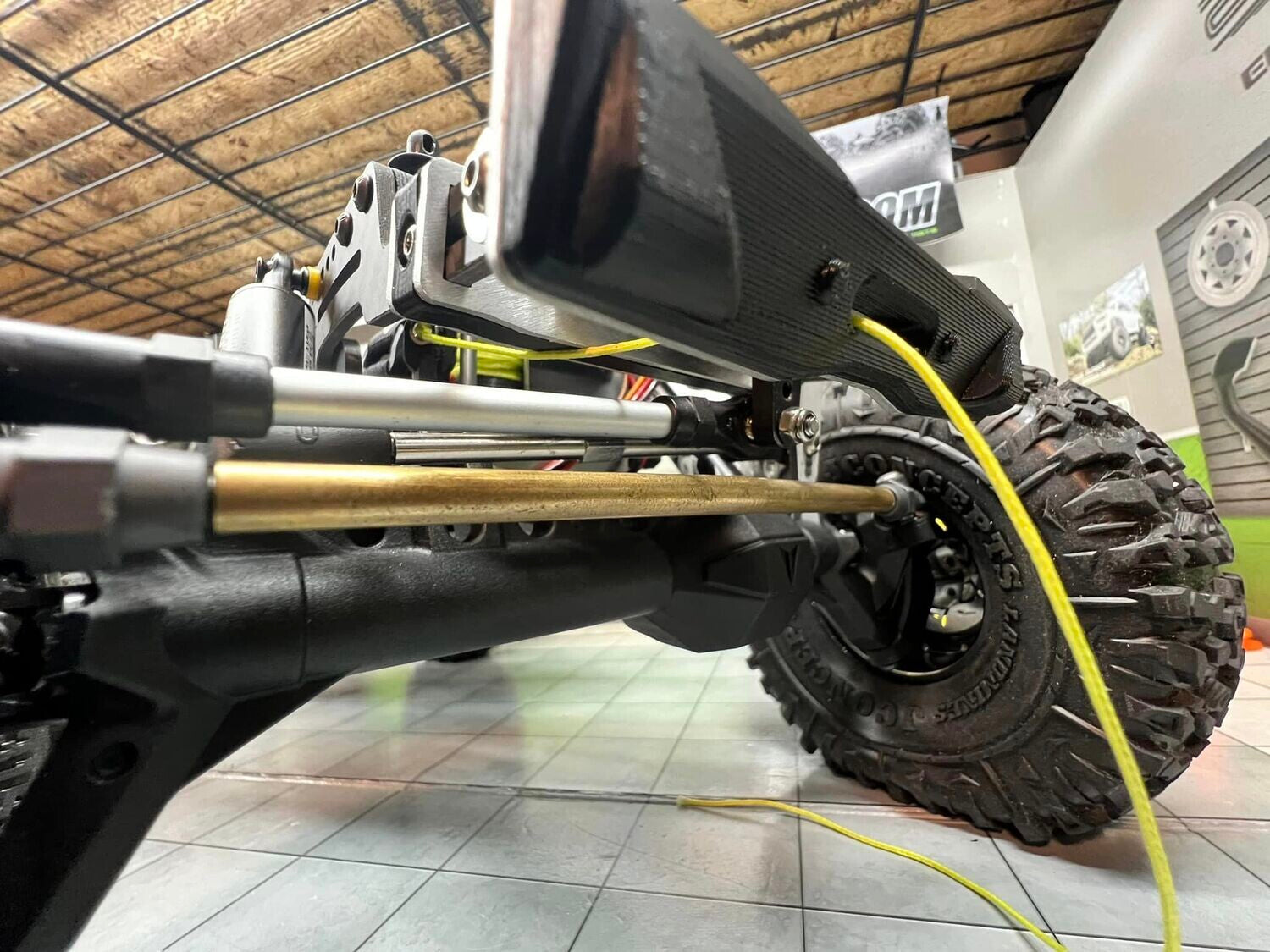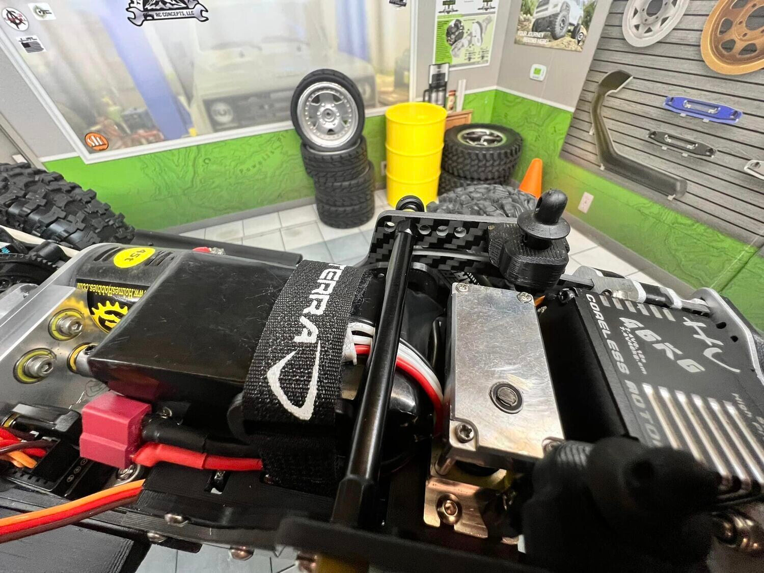 Front Mount: The front mount is adjustable allowing for driveline and upper link clearance. This mount may not work in some configurations (Any forward motor/spur that extends beyond the lower links like the TRX4 transmission) This mount includes additional slots to strap down a battery and a location for a servo winch. Internally spooled winch works best with rod end fasten to the ear to help guid the string back on the spool.