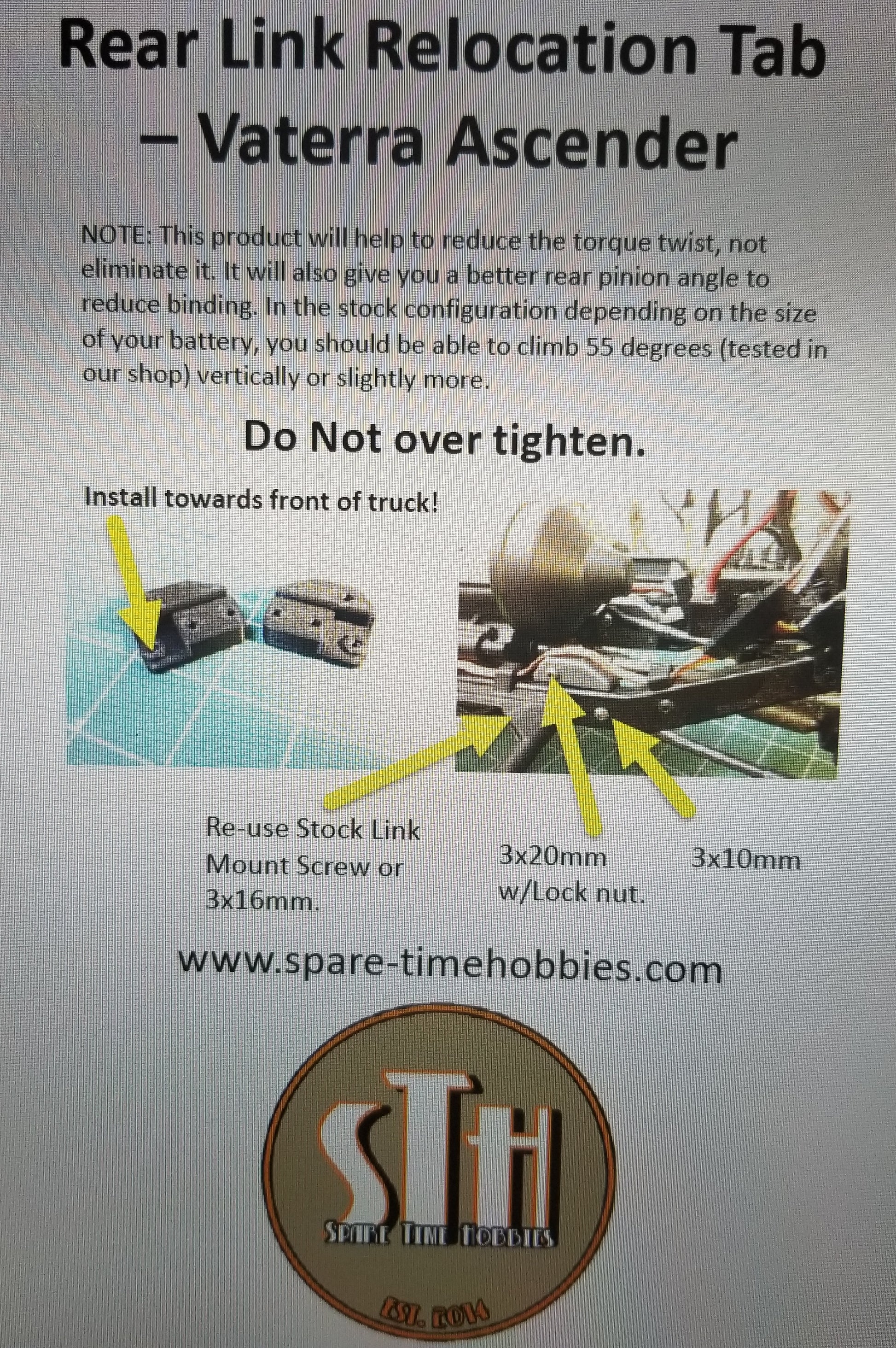 Please be aware that Spare Time Hobbies 3D printed products may have longer shipping times due to the specialized manufacturing process. However, the performance gains and cleaner suspension geometry you’ll achieve with these Rear Link Relocation Tabs make the wait worthwhile. Upgrade your Vaterra Ascender K5 Blazer today and experience enhanced control, reduced torque twist, and improved hill-climbing capability!